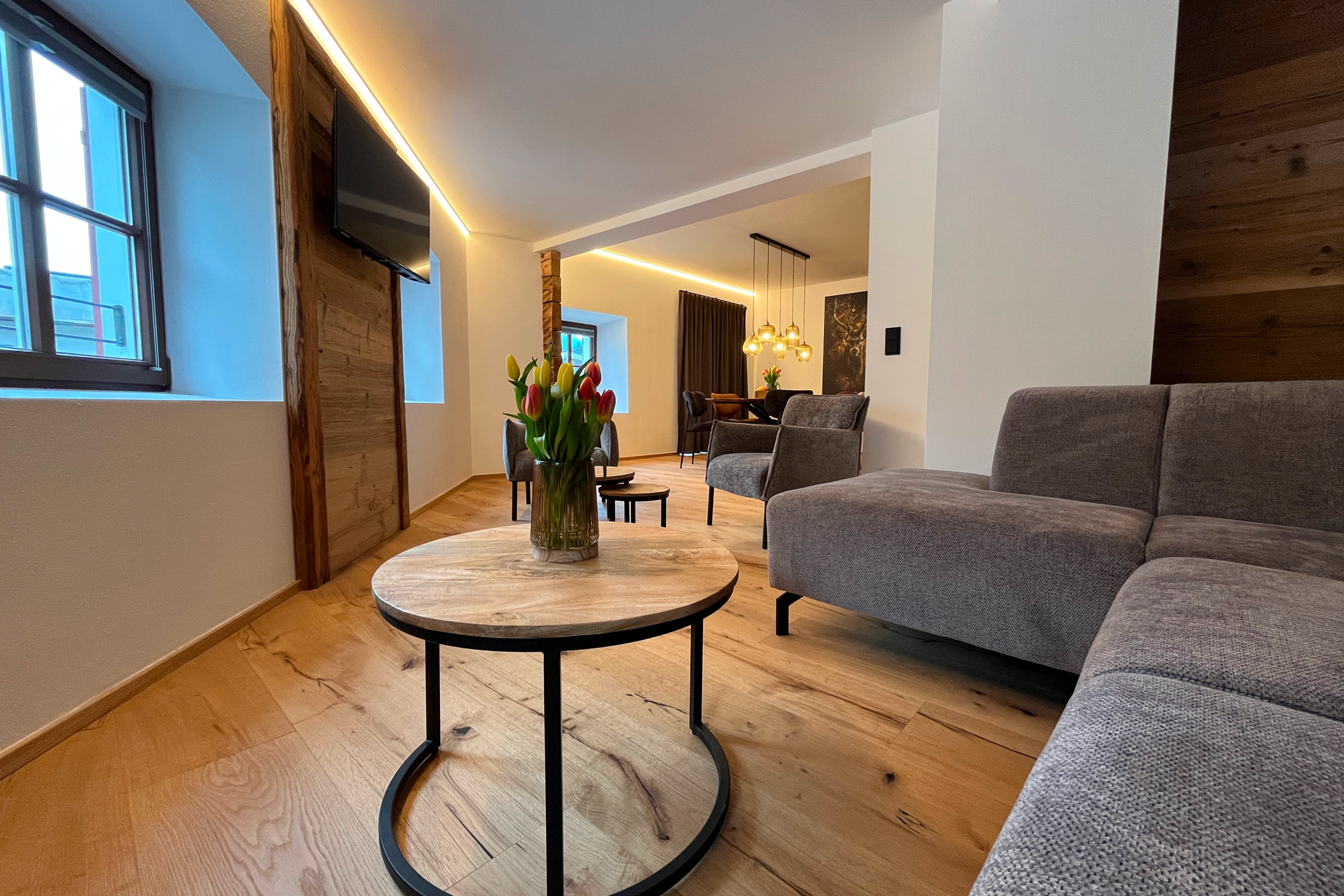 Das Apartment Schwarzer Adler ist eine der größten und komfortabelsten Unterkünfte des Gasthof Traube und bietet auf 110 m² reichlich Platz für bis zu 6 Gäste. In dem historischen Gebäude vereinen sich traditioneller Charme und moderner Komfort – die perfekte Wahl für Familien, Freundesgruppen oder Mehrgenerationenreisende.
